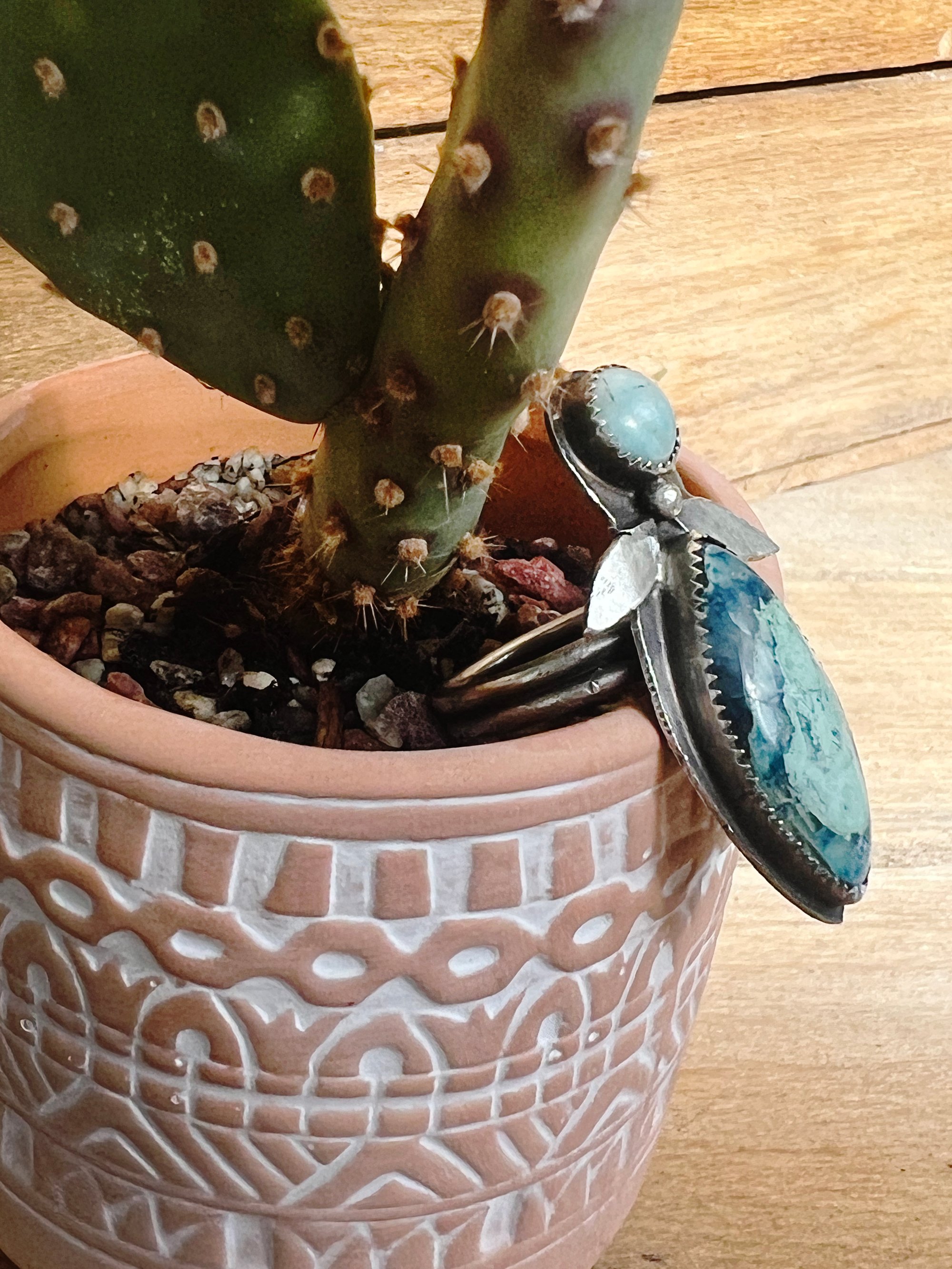 Size 8. This ring is made of sterling silver with two different amazonite stones. The ring's length is about 1.5 inches.