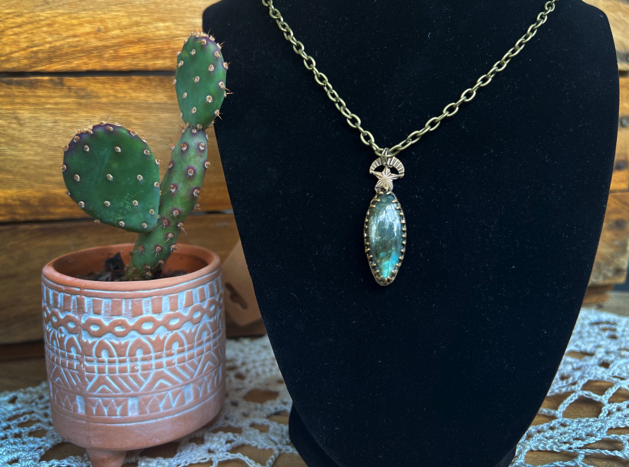 A beautiful tiger's eye pendant with brass accents. Chain is about 30 inches long and adjustable. The pendant itself is 1.5 inches long.
