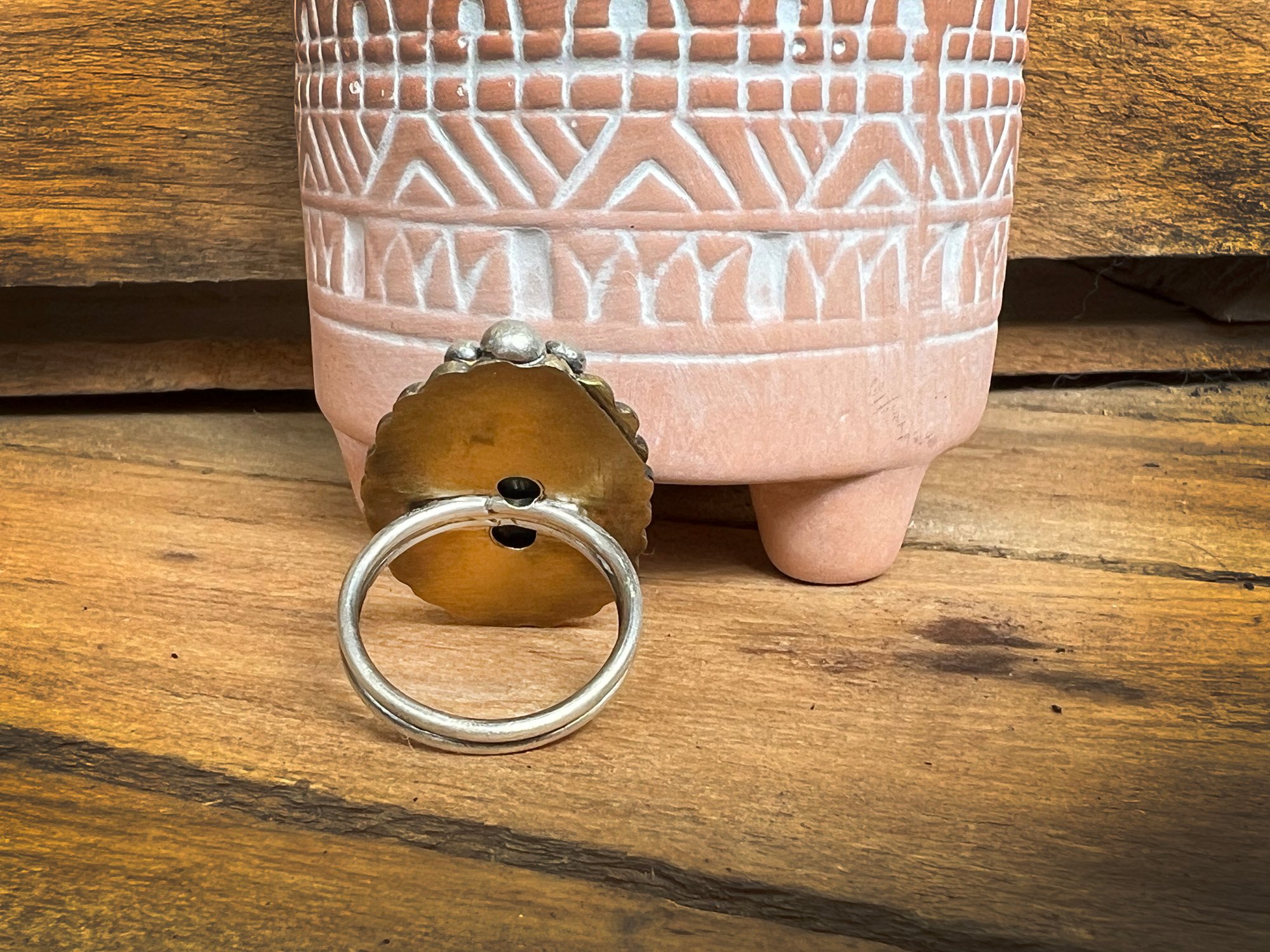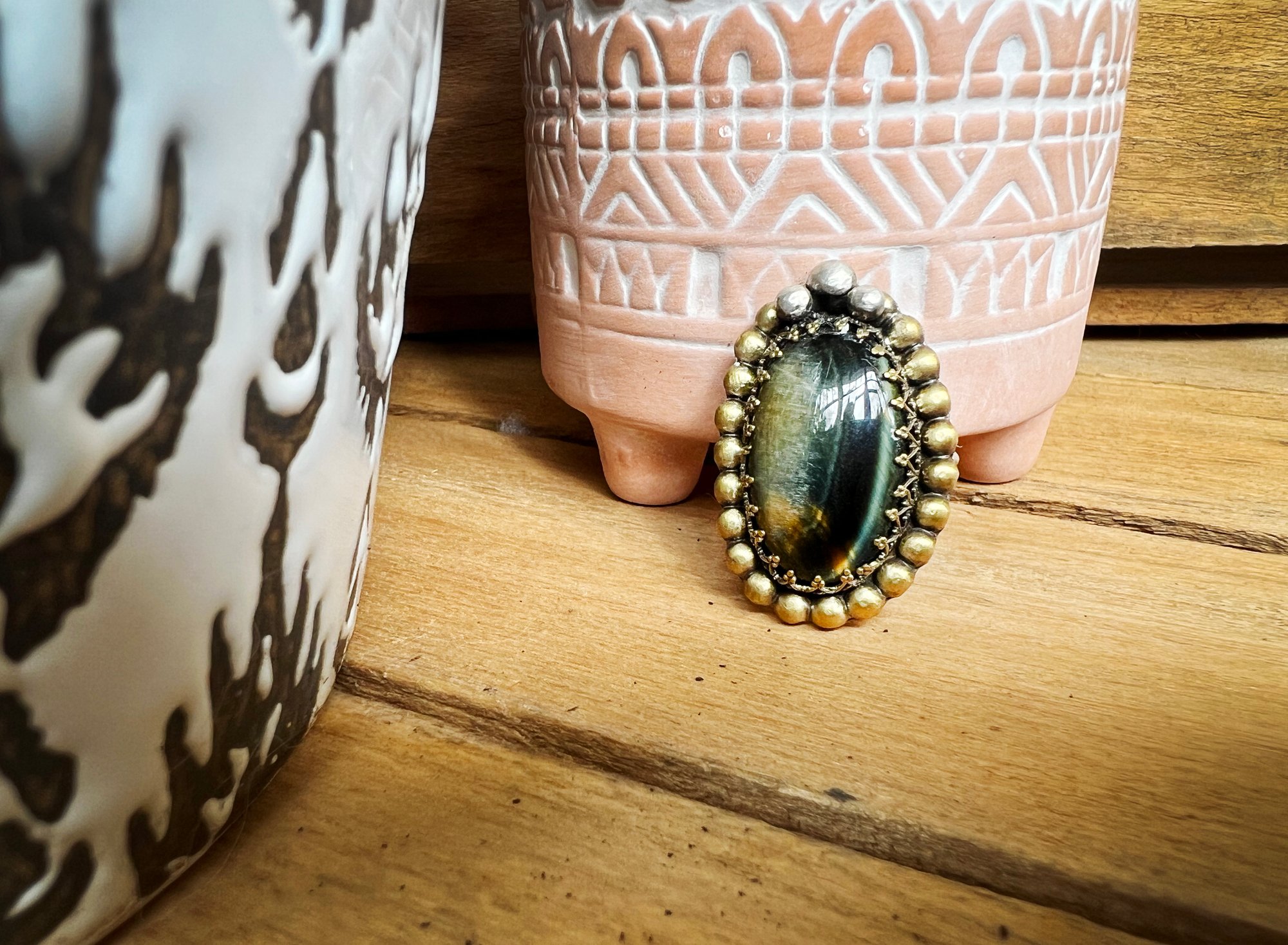 Size 9. This beautiful tiger's eye stone is accented with brass and sterling silver. The band of the ring is a doubled sterling wire while the ring backing is brass with sterling accents.
