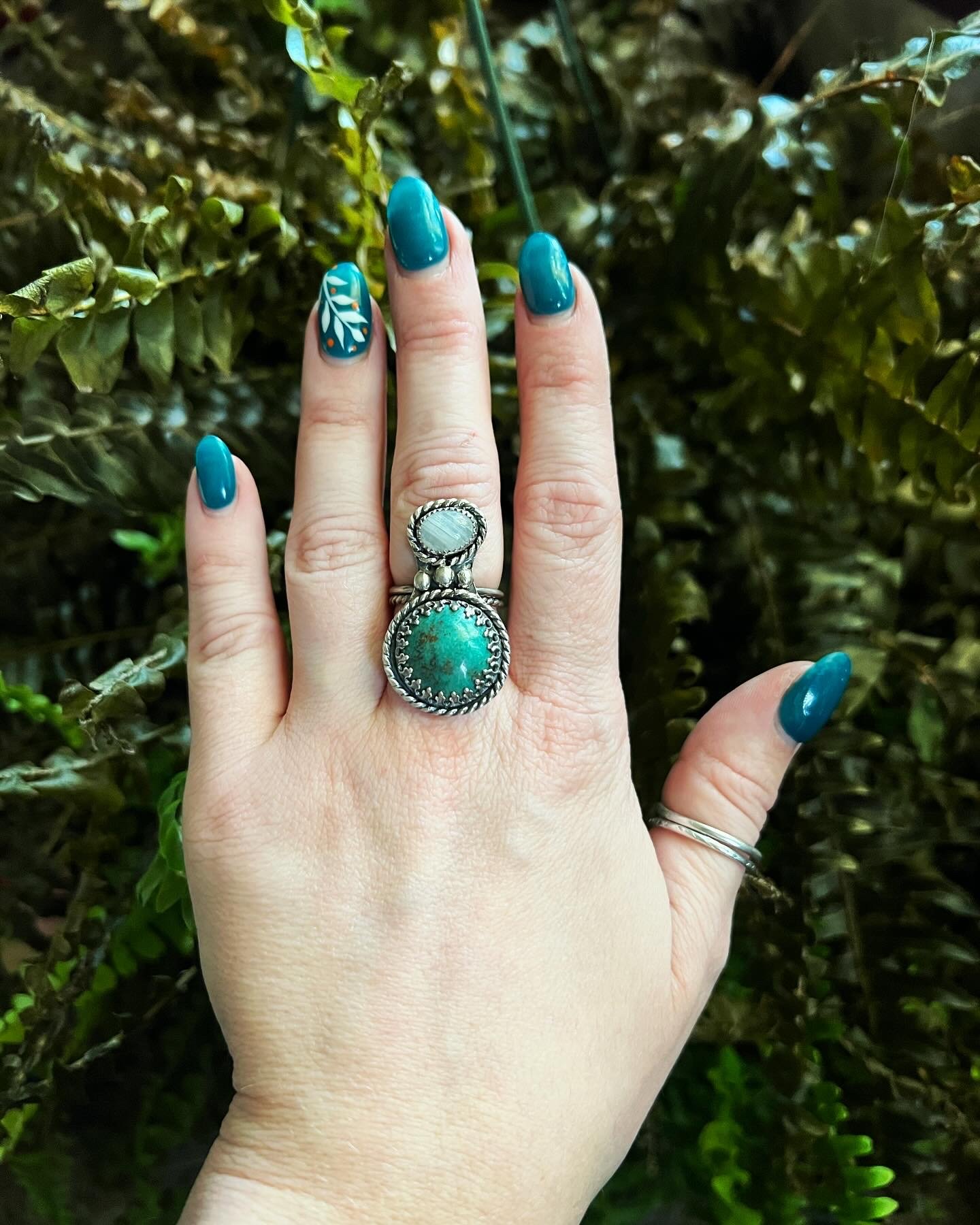 Size 6.5. Turquoise and moonstone accented with sterling silver.